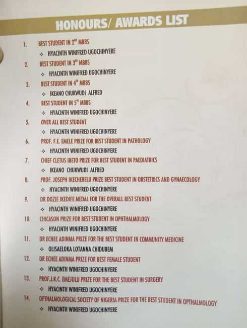 Other awards include Prof. Emele prize for best student in Pathology, Prof. Joseph Ikechebelu prize for best student in Obstetrics and Gynaecology, Dr. Dozie Ikedife medal for the overall best student, Dr. Echee Adinma prize for best student in Community Medicine, and best female student, Prof. Emejulu prize for the best student in Surgery, among others.