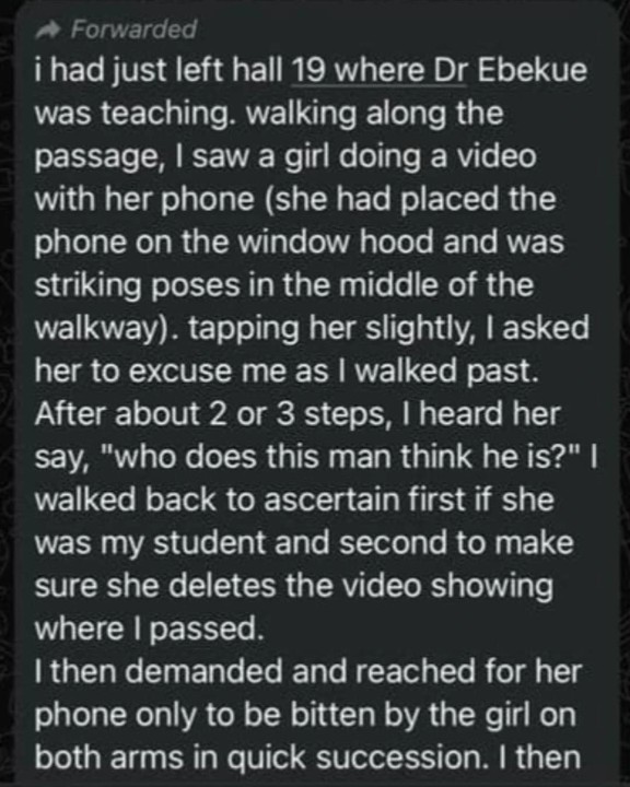 The incident, which occurred on campus, stemmed from an argument after the lecturer, identified as Dr. Chukwudi Michael, interrupted the student while she was recording a dance video in the faculty corridor.