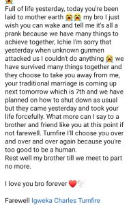 “Full of life yesterday, today you’re been laid to mother earth. my bro I just wish you can wake and tell me it’s all a prank because we have many things to achieve together, Ichie I’m sorry that yesterday when unknown gunmen attacked us I couldn’t do anything.