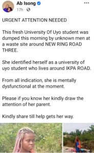 An unidentified young girl who is said to be a student of the University of Uyo, has been found wandering in a refuse site.