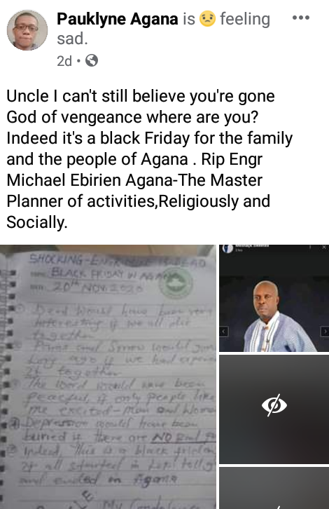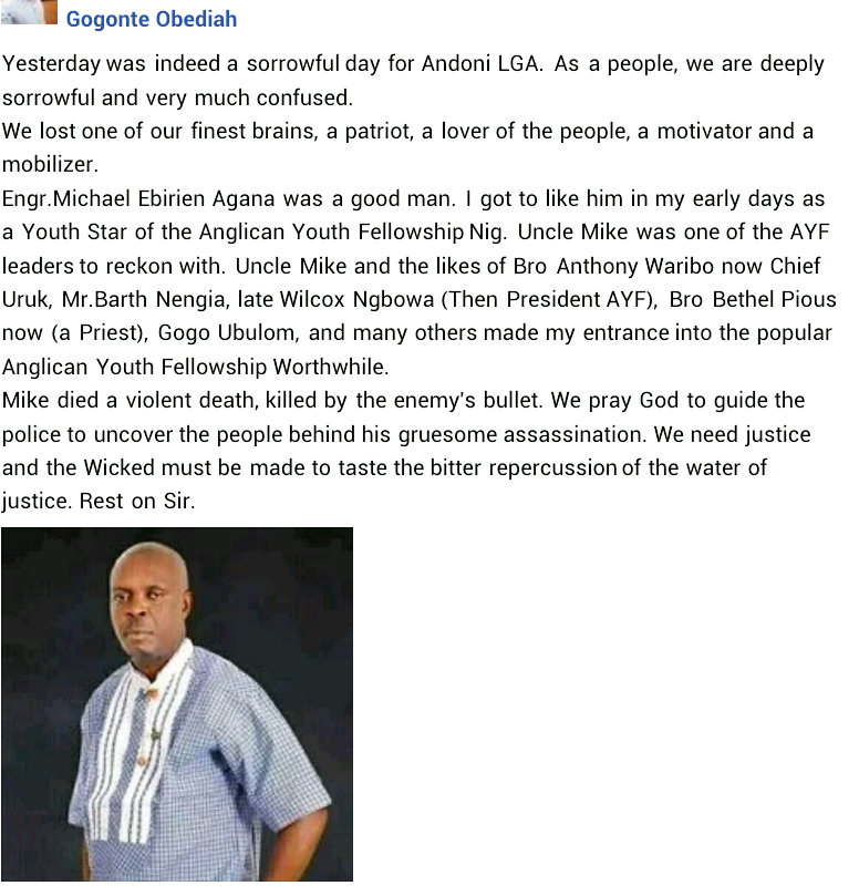 Engr.Michael Ebirien Agana was a good man. I got to like him in my early days as a Youth Star of the Anglican Youth Fellowship Nig. Uncle Mike was one of the AYF leaders to reckon with. Uncle Mike and the likes of Bro Anthony Waribo now Chief Uruk, Mr.Barth Nengia, late Wilcox Ngbowa (Then President AYF), Bro Bethel Pious now (a Priest), Gogo Ubulom, and many others made my entrance into the popular Anglican Youth Fellowship Worthwhile.