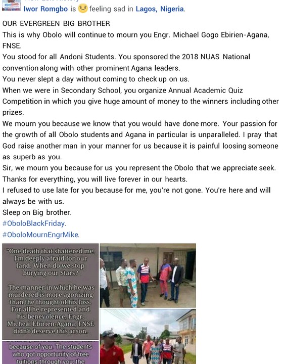 Mike died a violent death, killed by the enemy’s bullet. We pray God to guide the police to uncover the people behind his gruesome assassination. We need justice and the Wicked must be made to taste the bitter repercussion of the water of justice. Rest on Sir.”