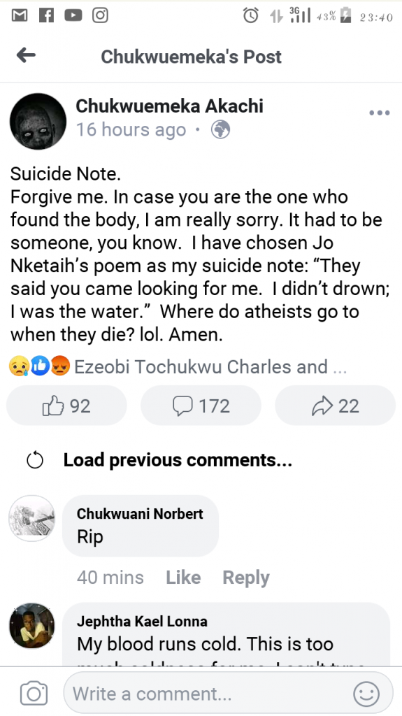 Akachi who is in English and literal studies died in the hospital. Though the reason for his action is not clear,he left a suicide note in his Facebook wall before taking a bottle of Snipper, he was rushed to UNN medical center before finally taken to University teaching hospital where he has been reported dead.