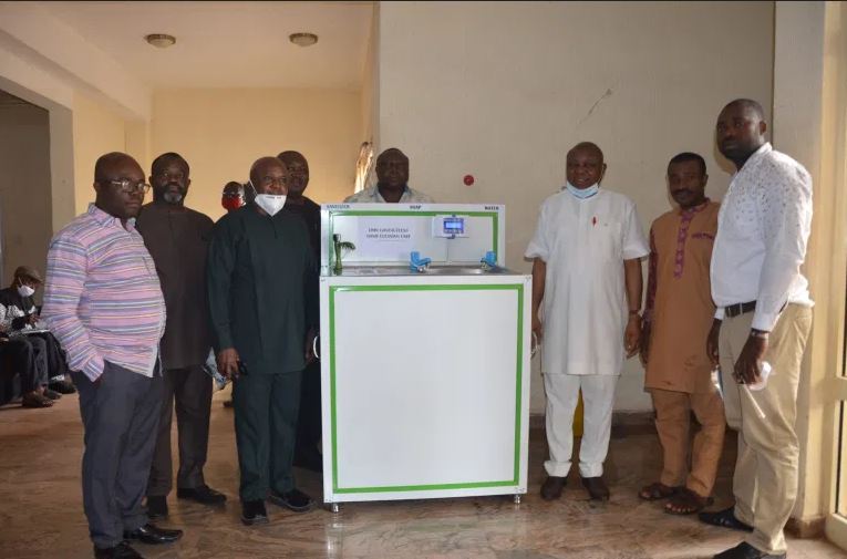 The University of Nigeria, Nsukka, UNN, has launched a contactless digital hand-cleaning machine that uses sensor to monitor body temperature, dispenses hand sanitizer, detergent and water.