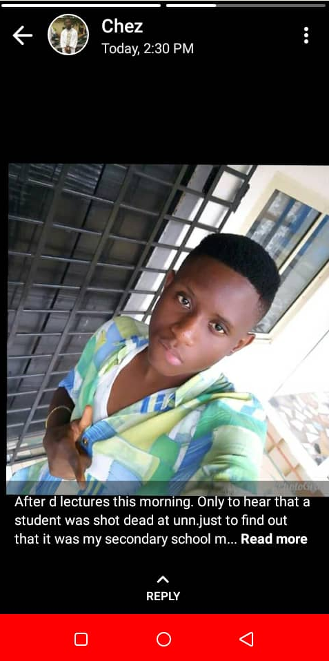 A 400level student of the university of Nigeria NSUKKA shot dead by some unknown gun men at a lodge located at hilltop in NSUKKA town area.