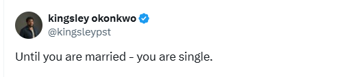 Clergyman and relationship coach, pastor Kingsley Okonkwo, has said that anyone who is not married is single.