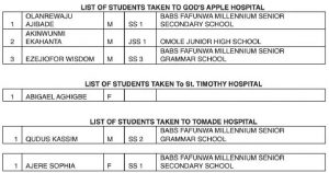 “For those that were transferred to LASUTH, they are all in stable condition. We only have one left at God’s Apple Hospital, all others have been discharged and by tomorrow we’ll give an update on those that were discharged. Also, two other students have been treated and discharged.