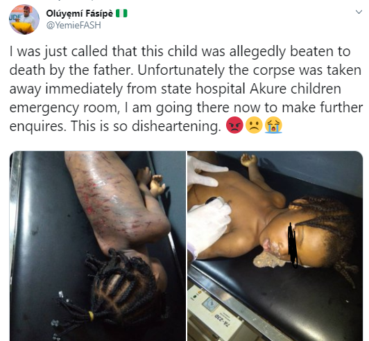Twitter user@YemieFASH who initially shared the sad story online, has given an update. According to him, Testimony Toke Babaloloa was being abused by her parents who believed she was evil. He posted new photos of the little girl with her battered body on Twitter and wrote;