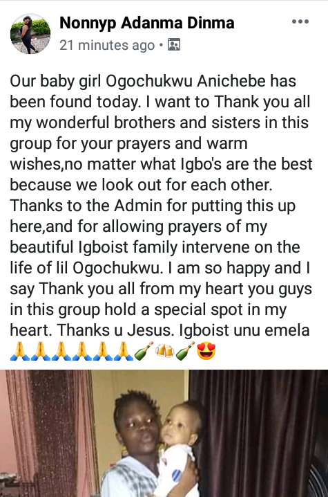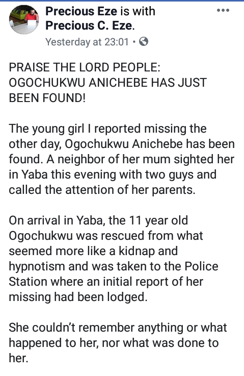 The young girl I reported missing the other day, Ogochukwu Anichebe has been found. A neighbor of her mum sighted her in Yaba this evening with two guys and called the attention of her parents.