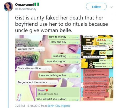 Those close to Wendy also backed up Best Jide’s claim, as they disclosed that she faked her death because her boyfriend allegedly impregnated another girl.