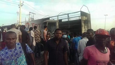 A fully loaded 33,000 litres of PMS (Petrol) tanker lost control, crashed and exploded at a densely populated and busy Cele bus stop along Oshodi Badagry Express way yesterday. It caused serious traffic as firefighters and other response officials tried to control the fire from spreading. The National Emergency Management Agency (NEMA) reports that two people were burnt beyond recognition.