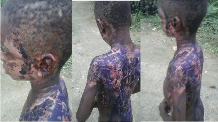 According to CrossRiverWatch, the matter was reported to the Odukpani division of the Nigeria Police Force but no action has being taken till date. Exclusive photos obtained by CRW shows Daniel is obviously not responding well to treatment as his body which is covered in Gentian Violet (GV) still show burns with blood clots. Moreover, he now moves around mostly naked.