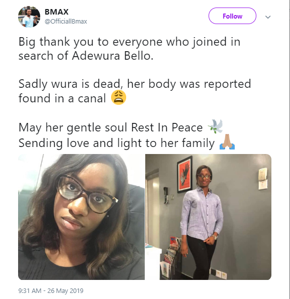 26-year-old Adewura Latifat Bello who went missing on May 15, 2019 in Lagos, has been found dead.