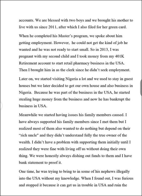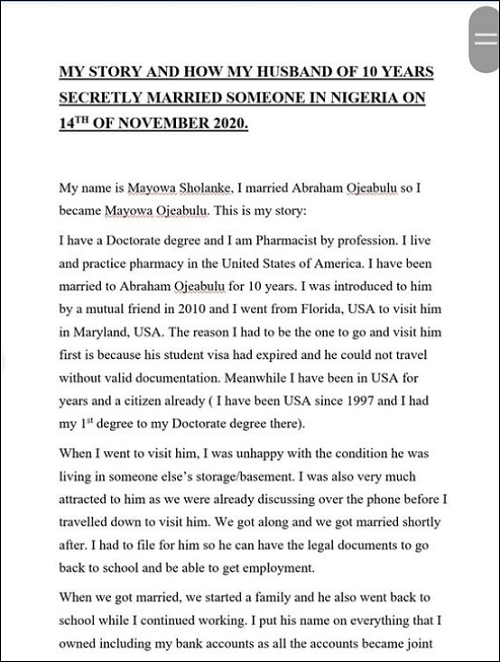 A US based Nigerian lady identified as Mayowa Sholanke took to social media to reveal startling details of how her husband of 10 years, Abraham Ojeabulu abandoned her and their kids in the US to marry a new wife in Nigeria.