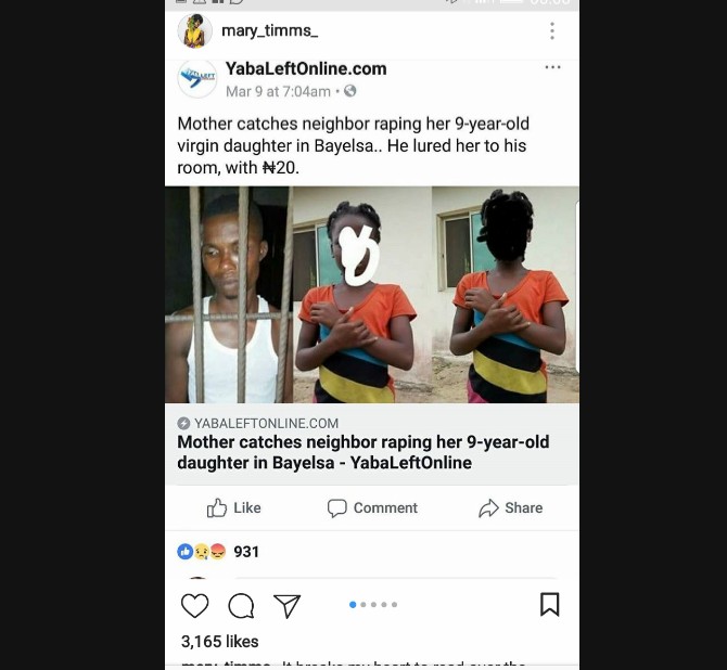Following the story online about a 31 year old man raping a small girl of 9 years, US based Nigeria model and Founder of Mary Timms Foundation has reacted over the incidence.