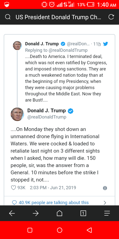 President of the United States of America, Donald Trump, has said the US military was ready to retaliate against Iran but he changed his mind 10 minutes before the planned strike.