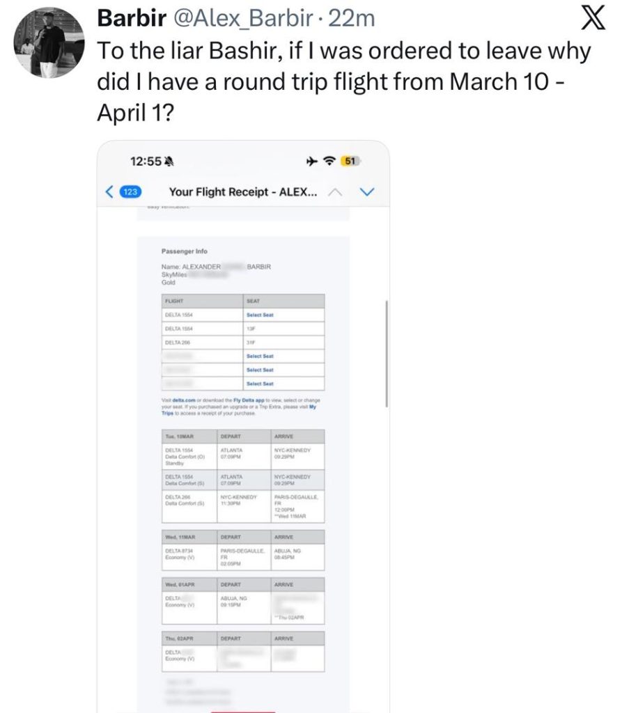 In a post shared on X, Alex stated that he had earlier purchased his return ticket out of nigeria for April 2. He stated that his ticket was from March 10 to April 1.
