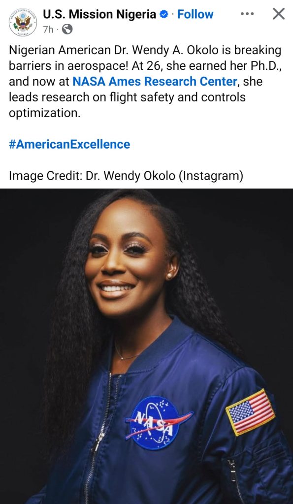 The embassy took to its Facebook, X, and Instagram accounts to spotlight Wendy A. Okolo, describing her as a barrier-breaking Nigerian-American researcher working at the NASA Ames Research Center.