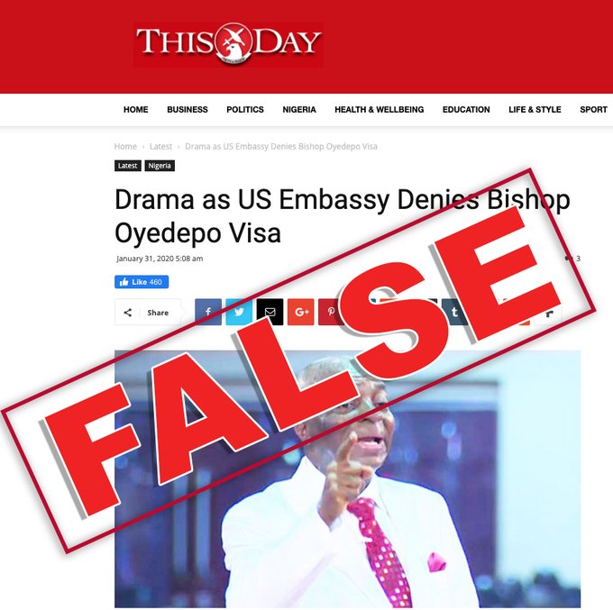 #FalseNews Alert! Be advised, the reports making the rounds about a visa being denied to Nigerian Bishop Oyedepo are false.