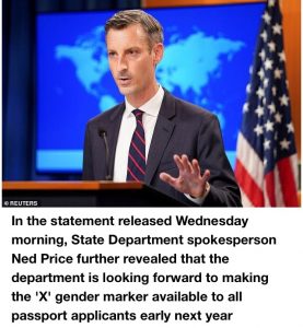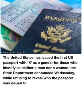 GENDER ‘X’ : The US has issued its first passport offering a third gender designation, ‘X’ for those who identify as intersex, the State Department announced Wednesday