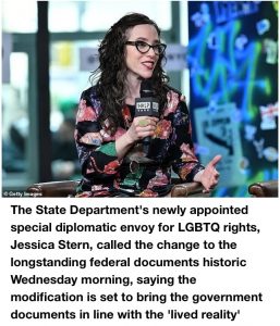 The State Department’s newly appointed special diplomatic envoy for LGBTQ rights, Jessica Stern, was among those praising the passport update.