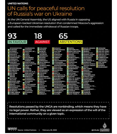 Separately, the UN Security Council adopted a US-drafted resolution, titled The Path to Peace, which calls for an immediate end to the conflict and advocates for lasting peace. This resolution did not level any accusations against Russia and posed the conflict in neutral terms as a war between Moscow and Kyiv.