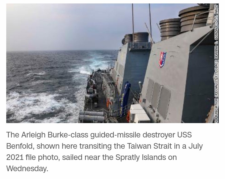 “On September 8th, the USS Benfold guided missile destroyer illegally broke into the waters adjacent to the Mischief Reef of Nansha islands without the approval of the Chinese government,” Air Force Col. Tian Junli, spokesperson for China’s Southern Theater Command, said in a statement. “The air force carried out follow-up surveillance and issued a warning to drive it away.”