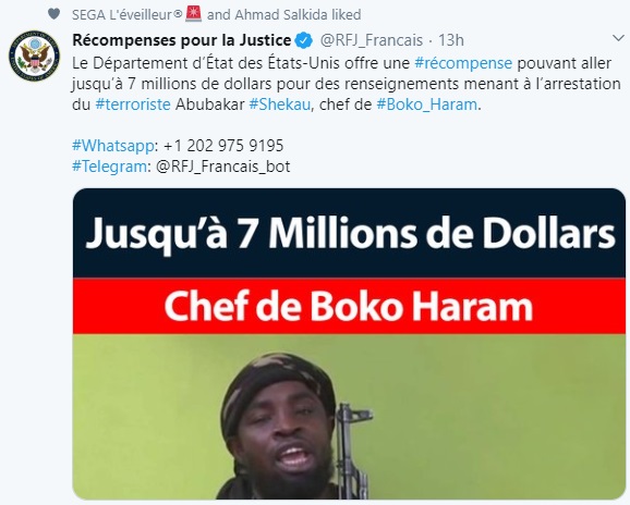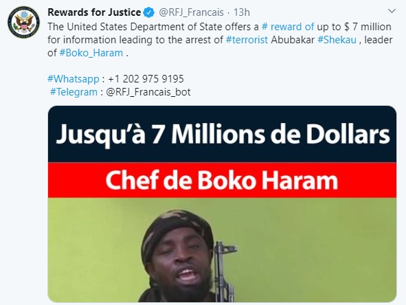 The US Department of State has revealed it will give a $7 million reward to anyone that can provide credible information that will lead to the arrest of Boko Haram leader, Abubakar Shekau.