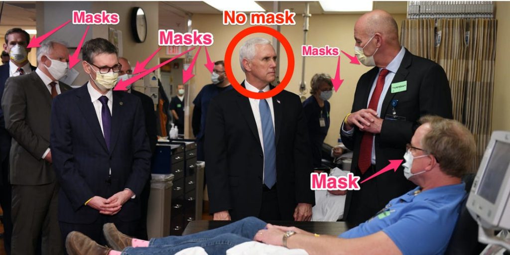 When Pence and the team, including reporters, arrived at the clinic, personnel from the facility had masks available for the group, including Pence. During the tour, the rest of the entourage wore masks except Pence.