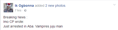 “Breaking News : Just arrested in Aba. Vampire’s juju man” Imo CP wrote.