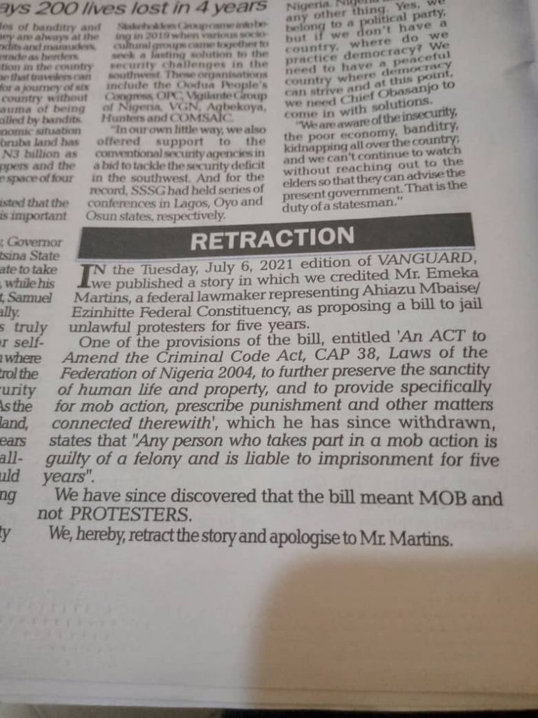 “in the Tuesday, July 6, 2021 edition of VANGUARD, we published a story in which we credited Mr. Emeka Martins, a federal Lawmaker representing Ahiazu Mbaise/Ezinihitte Federal Constituency, as proposing a bill to Jail unlawful Protesters for five years.