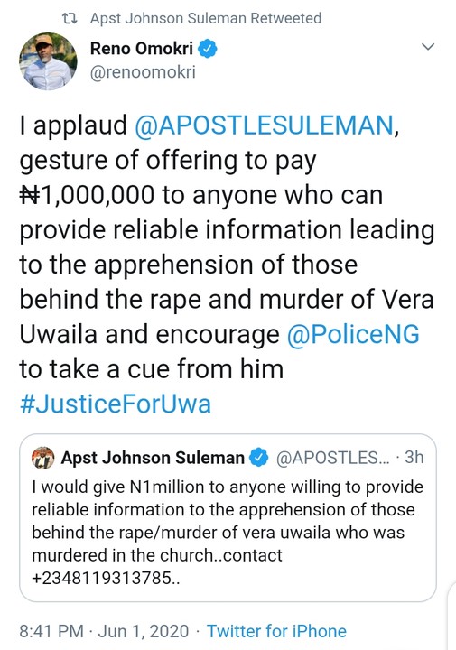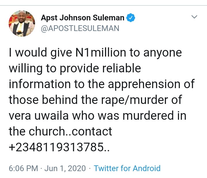 I would give N1million to anyone willing to provide reliable information to the apprehension of those behind the rape/murder of vera uwaila who was murdered in the church..contact +2348119313785..