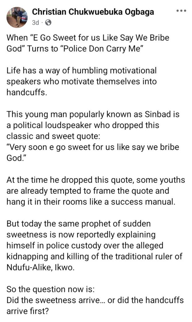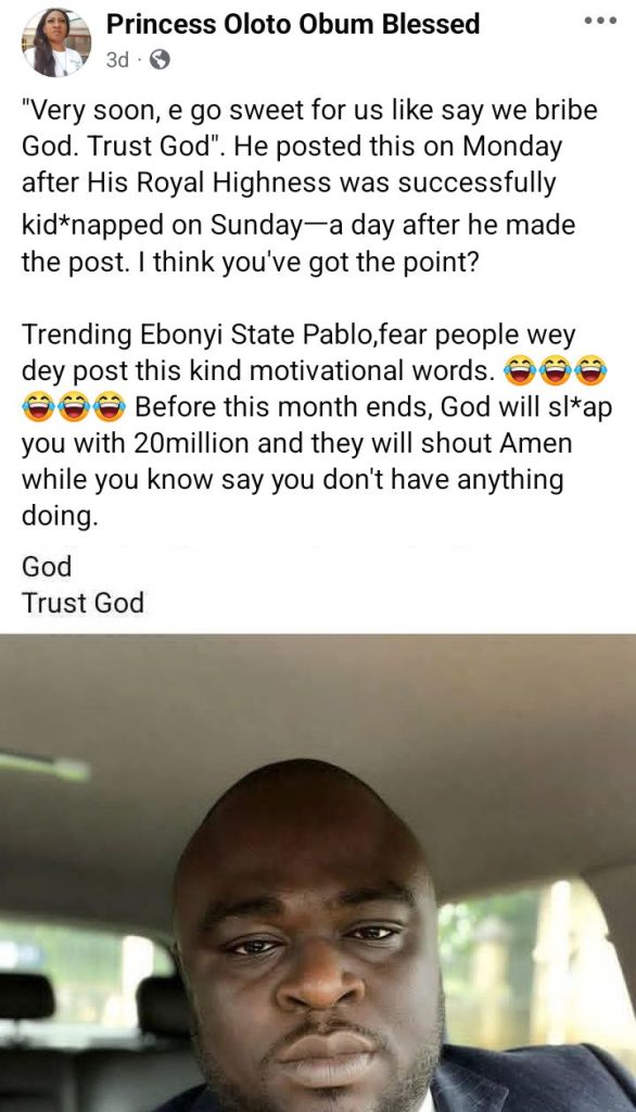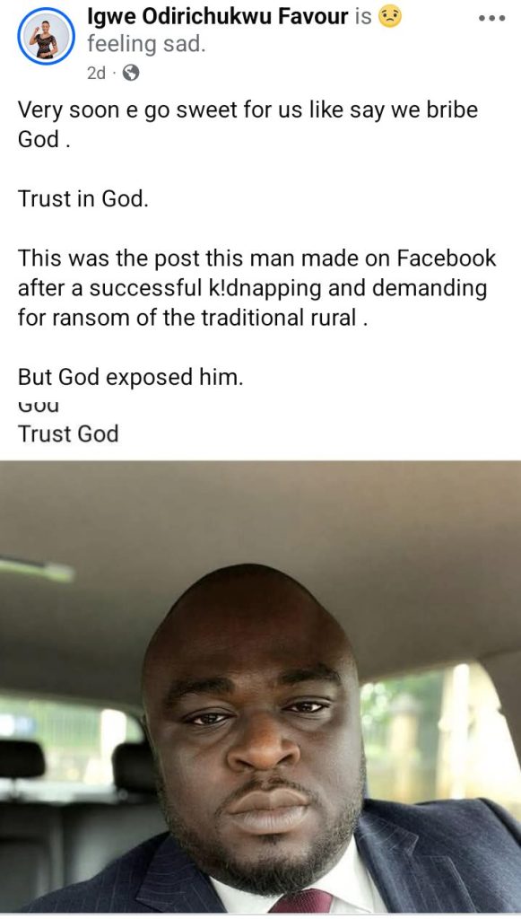 In a Facebook post dated March 3, two days after the abduction, Ogbuatu wrote; “Very soon, e go sweet for us like say we bribe God.”