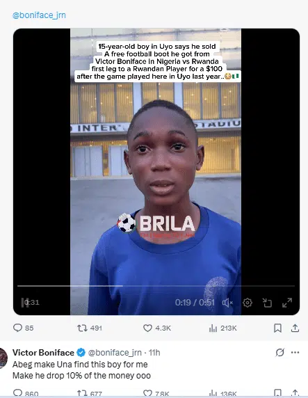 Popular footballer, Victor Boniface reacts as a 15-year-old boy he gave his boots, after the Nigeria vs Rwanda match, sells them for $100.
