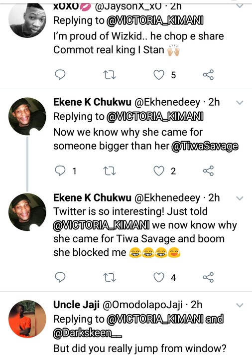 Amidst the vector and MI Diss, Victoria kimani tweeted in support of vector but she however didn’t anticipate when came next, as a Twitter user exposes her for always sneaking out to sleep with wizkid despite him dating omotayo at the time.