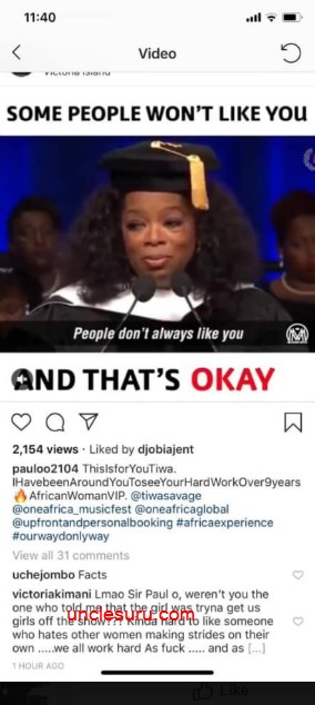 Sharing a video of Oprah Winfrey giving a motivational speech, he wrote;ThisIsforYouTiwa. IHavebeenAroundYouToseeYourHardWorkOver9years AfricanWomanVIP.