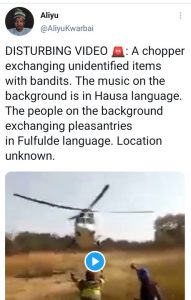 DISTURBING VIDEO A chopper exchanging unidentified items with bandits. The music on the background is in Hausa language.