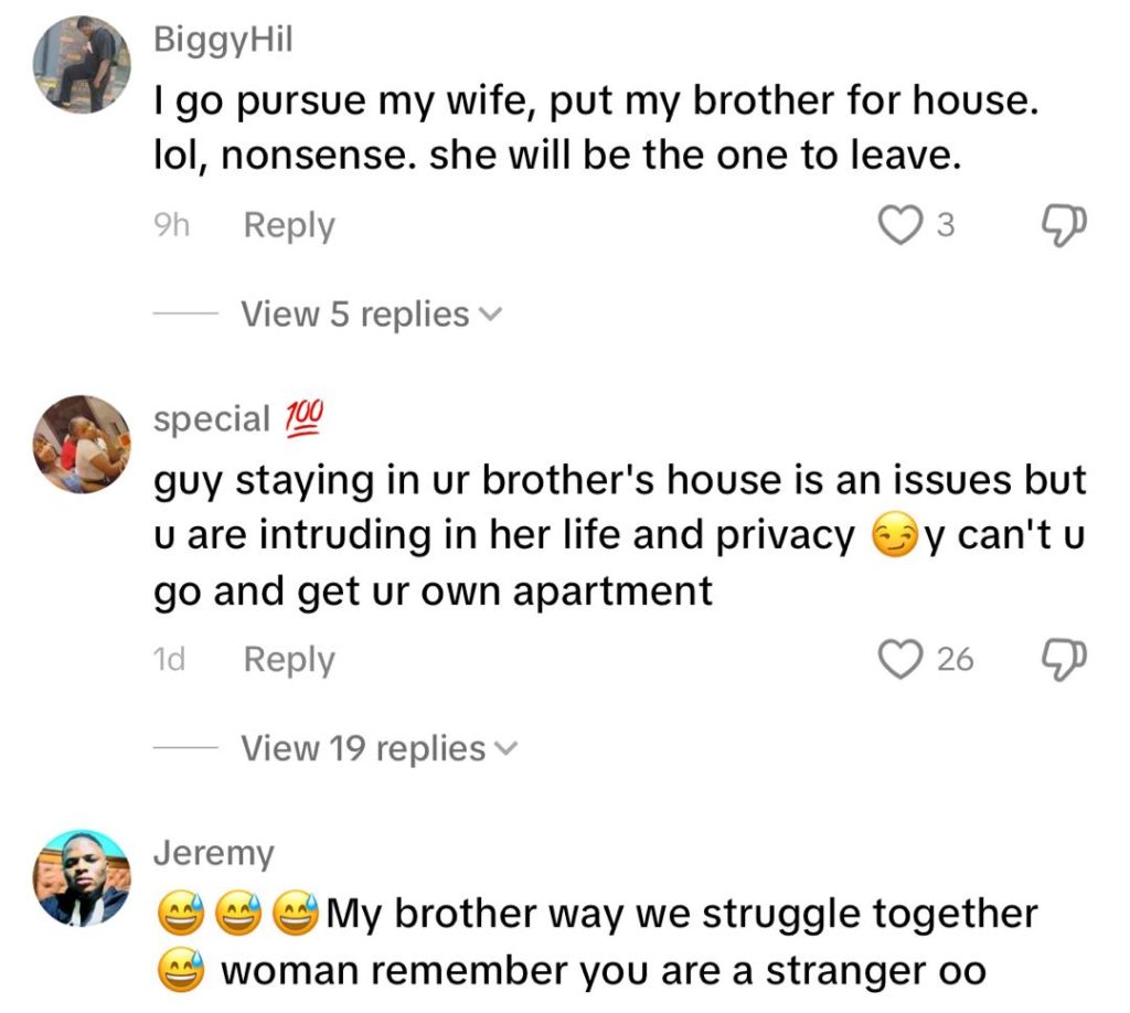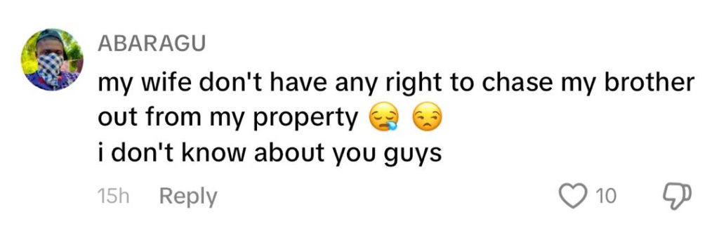 The video has sparked an online debate even though it is a skit as a lot of Nigerians can relate to it. While some are behind married women who are uncomfortable with their brothers-in-law living with them, others stated that it is not the duty of the wife to chase her husband’s brother or any other family member out of her matrimonial home.