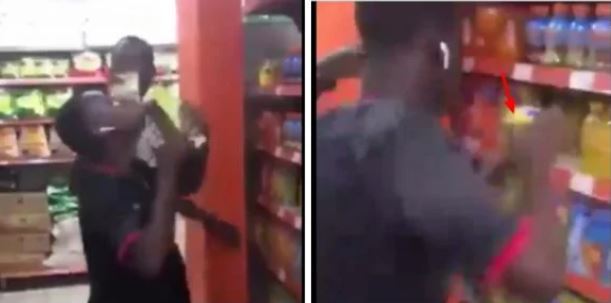In what appeared to be a deliberate footage, the young men were seen moving from one section of the shelf to another, drinking from the different packs available in the supermarket.