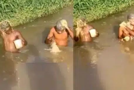 Two suspected ‘Yahoo Yahoo’ boys seeking favour for the fraudulent business were spotted bathing in a river with a special soap and local sponge.