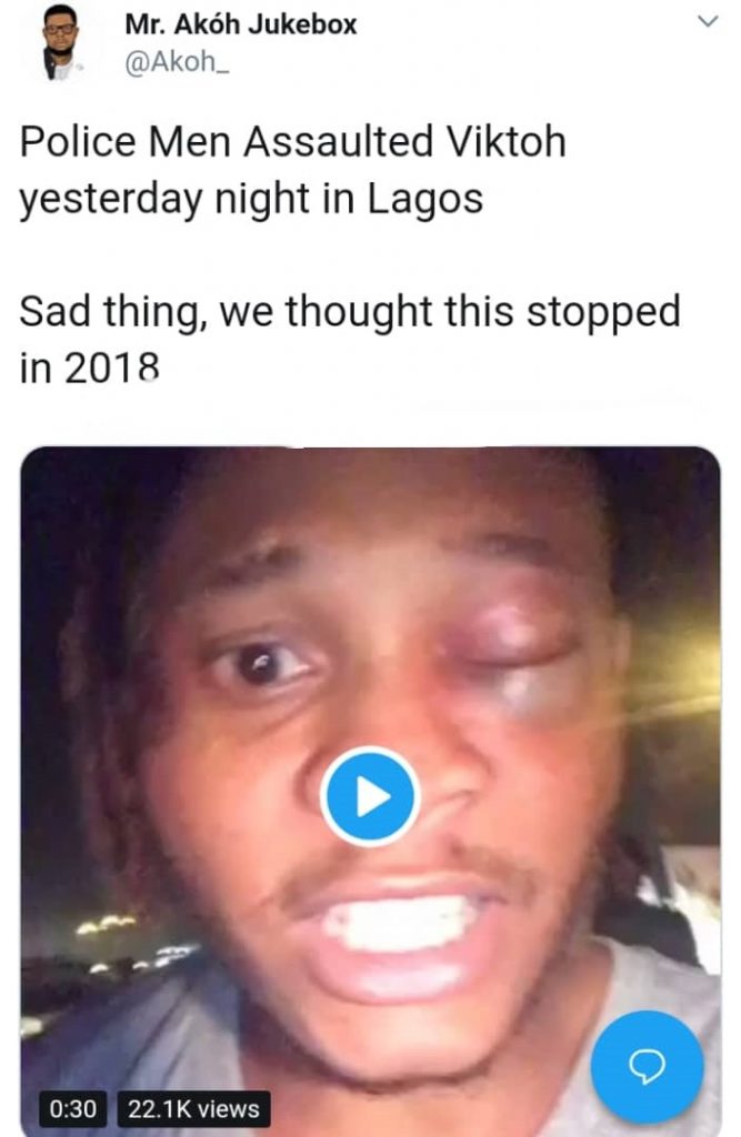 Policemen assaulted and beat Nigerian Artiste, Viktoh yesterday night in Lagos.