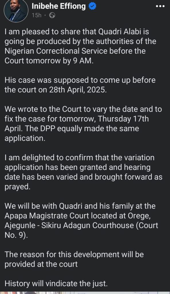 The release of Yusuf Alabi from detention was announced by human rights activist Inibehe Effiong, disclosing circumstances.