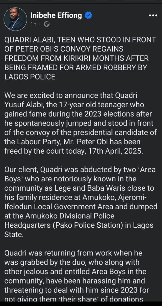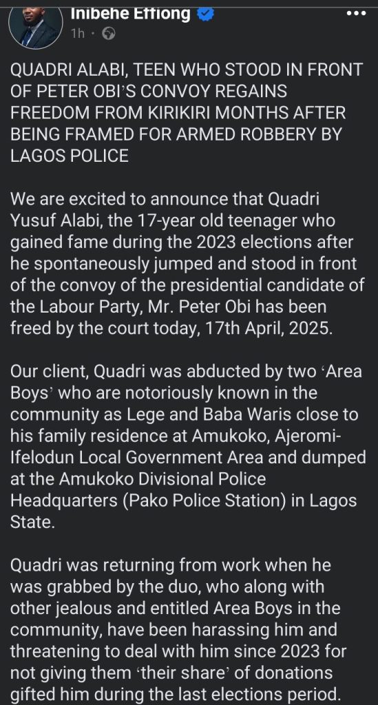 We are excited to announce that Quadri Yusuf Alabi, the 17-year old teenager who gained fame during the 2023 elections after he spontaneously jumped and stood in front of the convoy of the presidential candidate of the Labour Party, Mr. Peter Obi has been freed by the court today, 17th April, 2025.