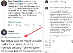 Former Presidential aide, Reno Omokri took to Instagram to defend those who attacked the Nigerian bride who got married as a virgin for sharing her blood-stained bedsheet on social media.