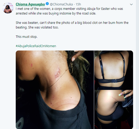 ”I met one of the women, a corps member visiting Abuja for Easter who was arrested while she was buying indomie by the road side. She was beaten, can’t share the photo of a big blood clot on her bum from the beating. She was violated too. This must stop.