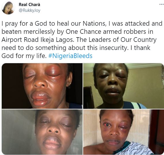 She wrote: “I pray for a God to heal our Nations, I was attacked and beaten mercilessly by One Chance armed robbers in Airport Road Ikeja Lagos.