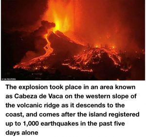 The explosion took place in an area known as Cabeza de Vaca on the western slope of the volcanic ridge as it descends to the coast, and comes after the island registered up to 1,000 earthquakes in the past five days alone.