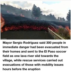 Mayor Sergio Rodríguez said 300 people in immediate danger had been evacuated from their homes and sent to the El Paso soccer field as one lava river slid towards the village, while rescue services carried out evacuations of those with mobility issues hours before the eruption.