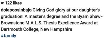 One of the daughters of the Vice president of Nigeria, Yemi Osibanjo has bagged a Master degree from Dartmouth College, New Hampshire, U.S.A The excited mom shared the news on instagram