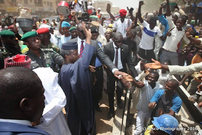 Vice President Yemi Osinbajo received a rousing welcome from residents of Kano state as he visited the state today to commission some projects executed by the state government and also commiserate with traders who lost their wares in the fire incident that occurred at the Muhammad Abubakar Rimi Market Sabon Gari Kano recently. Continue to see more photos.